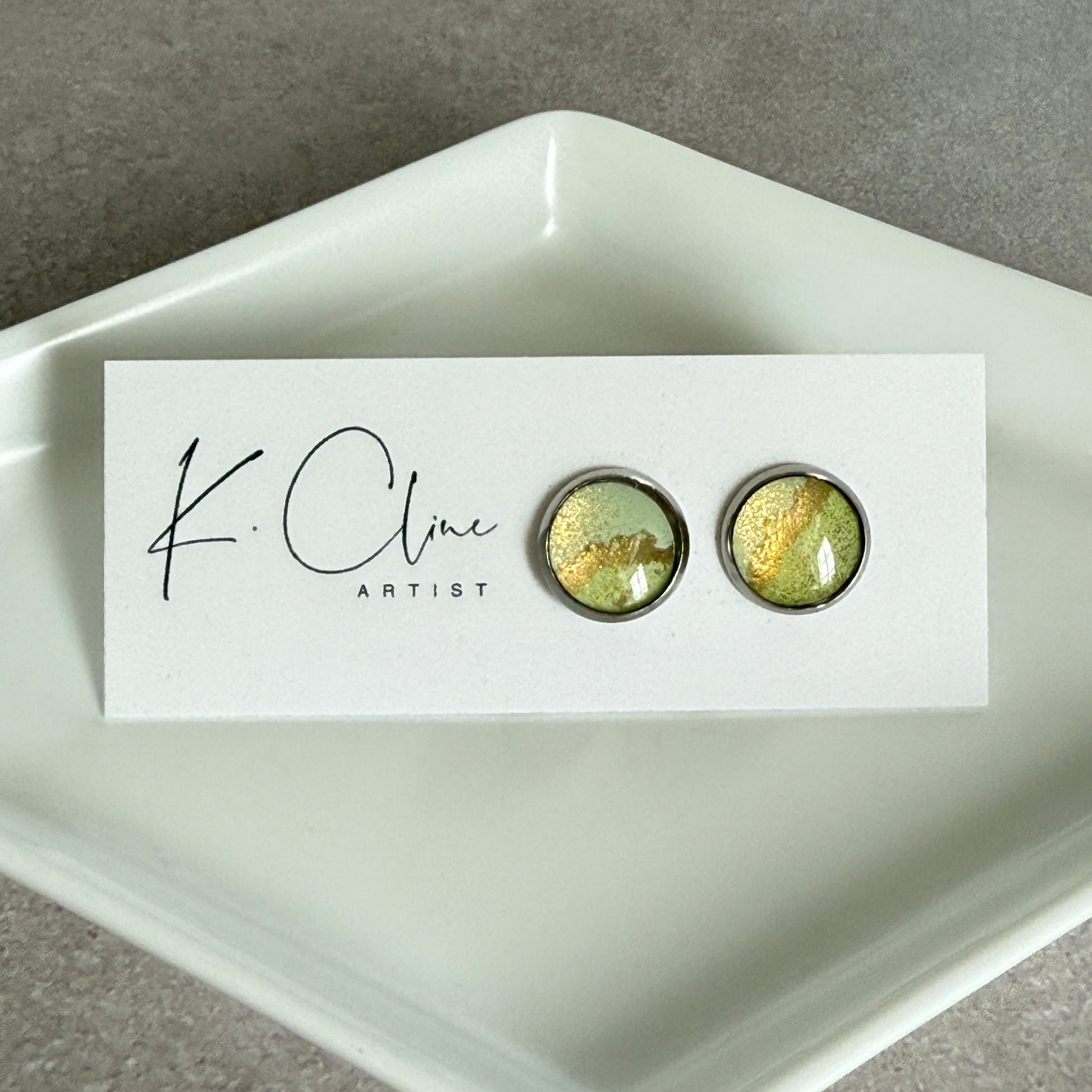 10mm stainless steel stud earrings set with clippings of my artworks and resin. It's a little piece of wearable art. :)