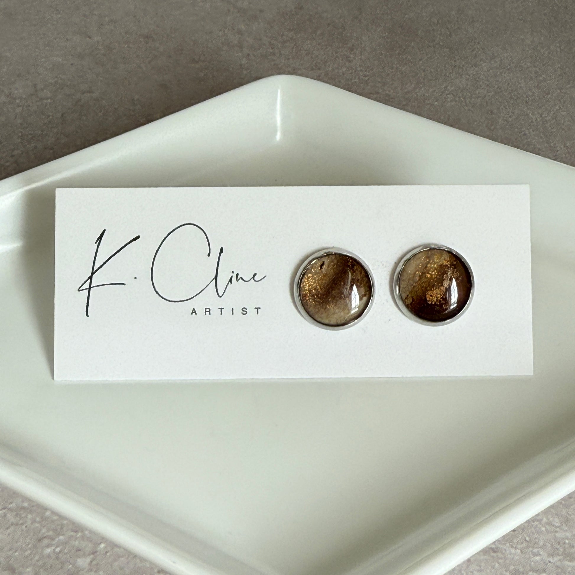 10mm stainless steel stud earrings set with clippings of my artworks and resin. It's a little piece of wearable art. :)