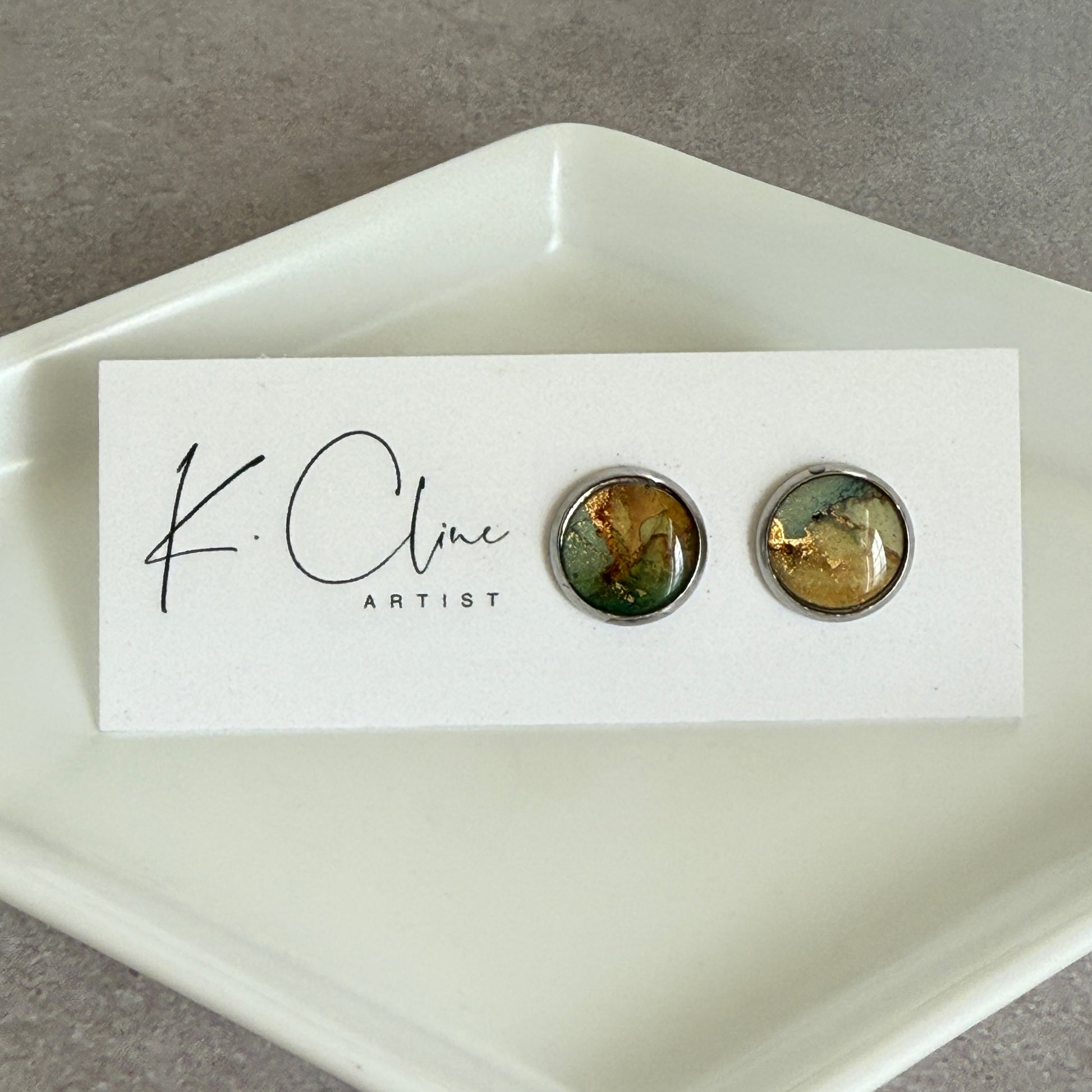 10mm stainless steel stud earrings set with clippings of my artworks and resin. It's a little piece of wearable art. :)